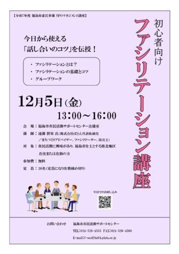 ふくサポ講座 2025年10月26日 初心者向け ファシリテーション講座 今日から使える「話し合いのコツ」を伝授! 講座概要 会場・参加条件等 場所福島市市民活動サポートセンター会議室対象市民活動に興味があり、福島市を主とする県北地区在住または在勤の方参加費無料定員20名(定員になり次第締め切り) チラシPDF 初心者向け ファシリテーション講座ダウンロード お申込み 下記フォームよりお申込みください。 https://forms.gle/oasUV2daecaAJQd77 « 前の記事ふくサポ講座一覧へ