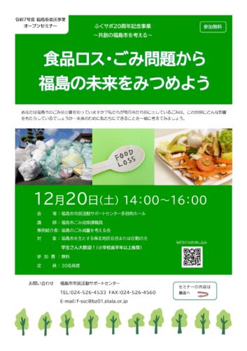 ふくサポ講座 2025年11月15日 食品ロス・ごみ問題から福島の未来をみつめよう 未来のために私たちにできることを一緒に考えましょう。 講座概要 会場・参加条件等 会場福島市市民活動サポートセンター 多目的ホール講師第1部福島市ごみ政策課職員第2部福島のごみ減量を考える会対象福島市を主とする県北地区在住または在勤の方学生さん大歓迎です♪ (小学校高学年以上推奨)参加費無料定員30名程度 チラシPDF オープンセミナーダウンロード お申し込み 下記フォームよりお申し込みください。 https://forms.gle/4HQT7h1X9JULFN8M8 « 前の記事ふくサポ講座一覧へ